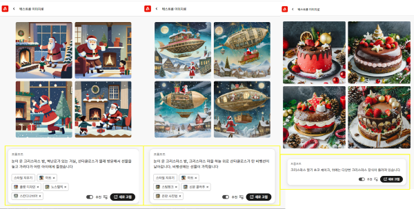 - 프롬프트 작성 (예: 빨강, 금색 오너먼트로 장식한 크리스마스 트리 상록수)