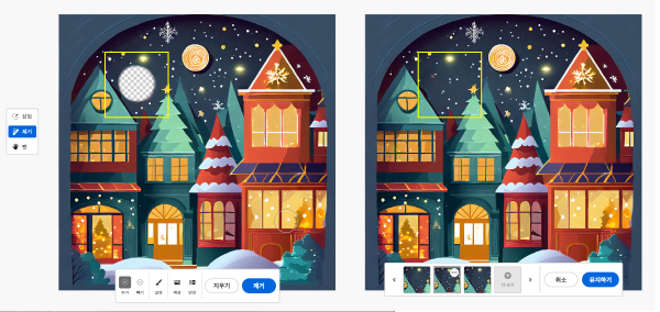 ‘생성형 채우기’ 기능에서는 ‘브러쉬’로 수정하고 싶은 부분을 표시한 후 프롬프트를 작성하여 원하는 이미지를 추가하거나 삭제할 수 있습니다.