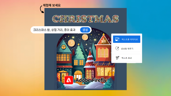실생활에 다양하게 쓰이는 이벤트 배너, 아이콘, 광고 등의 콘텐츠에도 활용해 보세요. 본 아티클에서는 어도비 파이어플라이에서 제공하는 다양한 생성형 AI 기술들을 소개하며, 간단한 크리스마스 아트웍을 만들어 보겠습니다.
