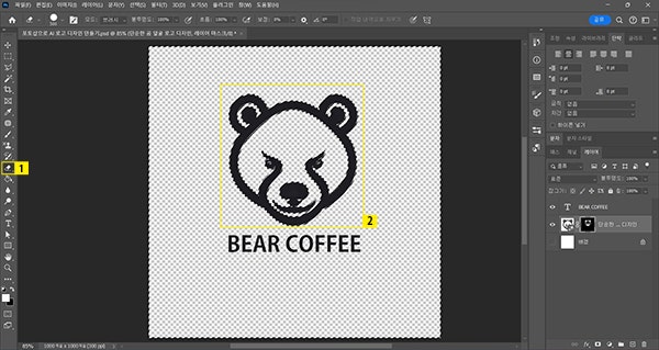 - 래스터화된 [BEAR COFFEE] 레이어와 [단순한 곰 얼굴 로고 디자인] 레이어 병합하기