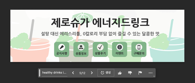 AI 그림 프로그램인 포토샵의 Generative fill 기능을 활용하면 아이콘뿐만 아니라 좀 더 과감한 아트워크를 추가할 수 있는데요. 요구하는 조건을 영어 텍스트로 입력만 하면 이미지를 생성합니다. 원하는 이미지가 나올 때까지 ‘생성’ 버튼을 눌러 다양한 결과물을 확인해 보세요.