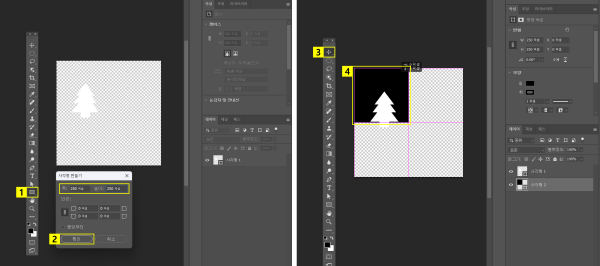- 캔버스의 1/4 크기로 사각형 폭 및 높이 설정 > ‘확인’ 클릭