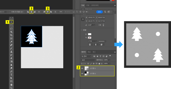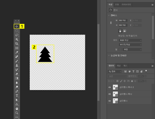 ‘삼각형 도구’를 사용하여 삼각형을 세 개 추가합니다. 먼저 한 개의 삼각형을 만든 후, 'Ctrl + J' 단축키를 눌러 레이어를 복제하면 동일한 모양의 삼각형을 손쉽게 추가할 수 있습니다. 그 다음에는 '이동 도구’를 사용하여 삼각형들의 위치를 조정함으로써 트리 모양을 완성합니다.