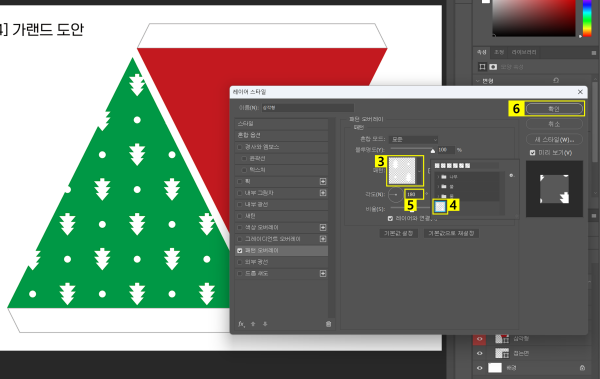 패턴 추가 작업을 마친 후에는 '크리스마스 가랜드 도안' 문서로 돌아와서 해당 패턴을 모양 레이어에 적용합니다. 이때 레이어 스타일 메뉴 내의 '패턴 오버레이' 기능을 활용하면, 직접 제작한 패턴을 레이어에 쉽게 적용할 수 있습니다.