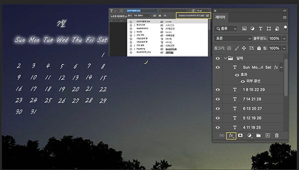 포토샵 텍스트 도구로 배경화면 꾸미기도 가능한데요. 원하는 글꼴로 달력을 만들 수 있죠. 만약 마음에 드는 글꼴이 없다면 어도비 폰트(Adobe Fonts)에서 폰트를 찾을 수 있어요. 한국어 글꼴의 경우 바탕, 돋움, 굴림, 디자인, 필기체 등 다양한 디자인을 만날 수 있습니다.
