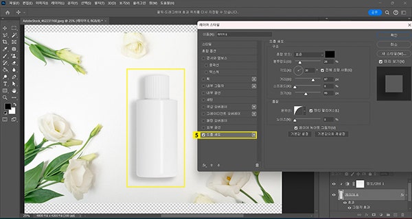 - [레이어0] 개체 레이어를 더블 클릭하여 혼합옵션 창을 띄우고 드롭 섀도 클릭하여 그림자 레이어 효과 주기