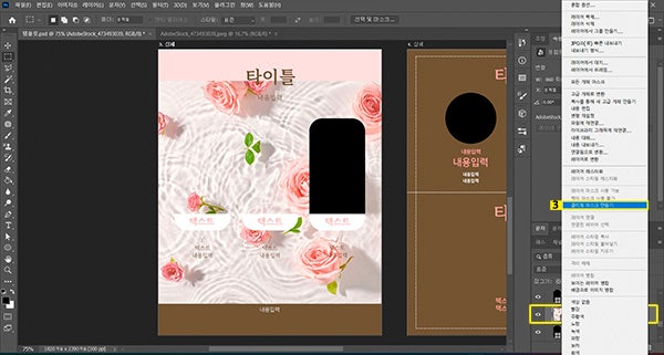 - 삽입할 사진의 레이어를 클릭하여 활성화 > 마우스 오른쪽 버튼 누르고 클리핑 마스크 만들기