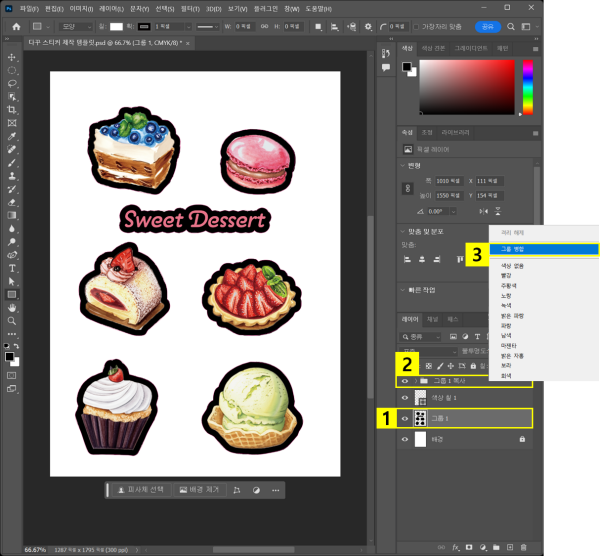 - [그룹 1 복사] 레이어 그룹 클릭하여 활성화 > ‘마우스 오른쪽 버튼’ 클릭