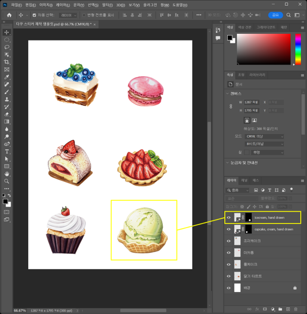 다운로드받은 다꾸 스티커 제작 템플릿 PSD 파일을 포토샵에서 열면, 109 x 152mm 사이즈의 캔버스와 스티커 개체 예시 레이어들을 확인할 수 있습니다. 또한, 해당 파일은 인쇄에 적합한 CMYK 색상 모드, 300dpi 해상도로 설정되어 있습니다.