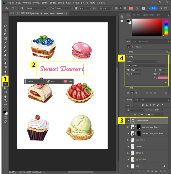 - 우측 ‘속성’ 패널 > ‘문자’ 옵션에서 글꼴 세부 설정 (폰트 이름: Pauline)