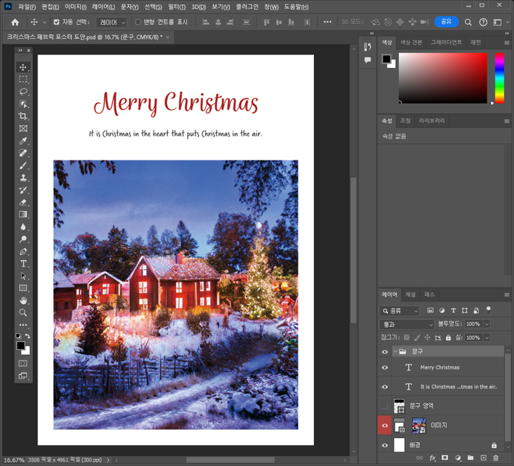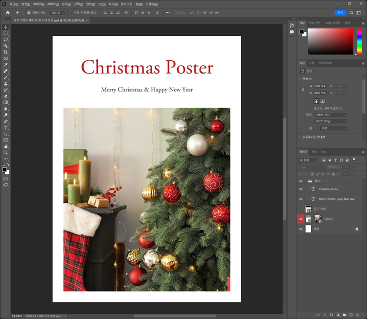 다운로드받은 크리스마스 패브릭 포스터 도안 PSD 파일을 포토샵에서 열면, A3 사이즈(297x420 mm)의 도안과 각각의 구성 요소 레이어를 확인할 수 있습니다. 또한, 해당 파일은 인쇄에 적합한 CMYK 색상 모드로 설정되어 있습니다.