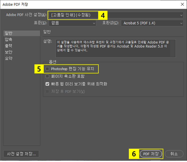 1. ‘Adobe PDF 저장’ 팝업 창에서 ‘사전 설정’ 선택 ([고품질 인쇄])