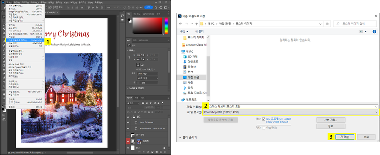 크리스마스 패브릭 포스터 디자인을 완성한 후, 인쇄를 위해 PDF 파일 형식으로 저장하는 것이 좋습니다. 포토샵에서 '다른 이름으로 저장' 기능을 활용하면 PDF 형식으로 간편하게 저장하고 작업을 마무리할 수 있습니다. 포스터 인쇄용 PDF 파일을 준비할 때는 고품질 인쇄 설정을 적용하는 것을 권장합니다.