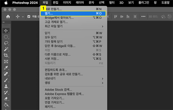 - 포토샵 실행 후 ‘파일 > 불러오기’ 또는 단축키 ‘Ctrl + O’로 사진 불러오기