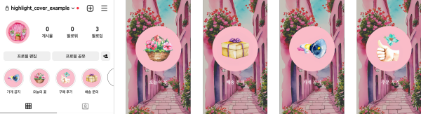 앞선 과정을 반복하여 총 4개의 하이라이트 커버를 완성했습니다. 다음은 완성본과 실제 인스타그램에 적용한 예시입니다. 톤앤 매너가 맞는 커버 이미지를 통해 효과적인 인스타그램 마케팅을 실현할 수 있습니다.