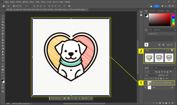 포토샵 AI 명령어를 반영한 로고 이미지가 생성되었습니다. 생성형 레이어와 결과를 확인하고 속성 패널에서 변형 결과를 선택해보세요. 3개의 결과가 모두 마음에 들지 않는다면, ‘생성’ 버튼을 클릭하여 추가로 AI 로고를 생성할 수도 있습니다.