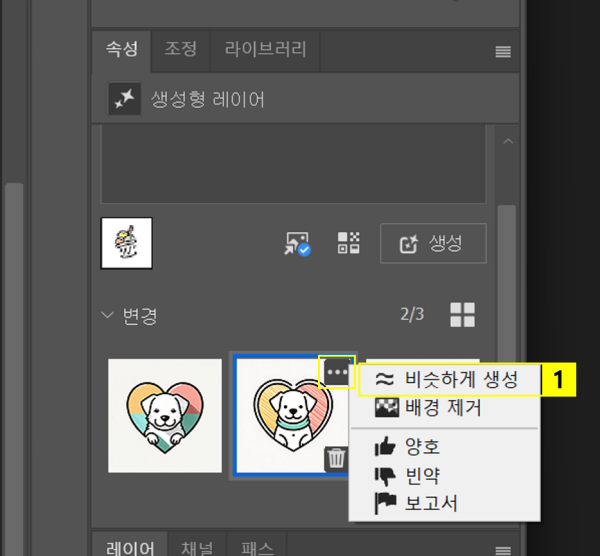 - 우측 ‘속성’ 패널 > 마음에 드는 결과에 마우스 올리기 > ‘세 점 아이콘(…)’ 클릭 > ‘비슷하게 생성’ 클릭
