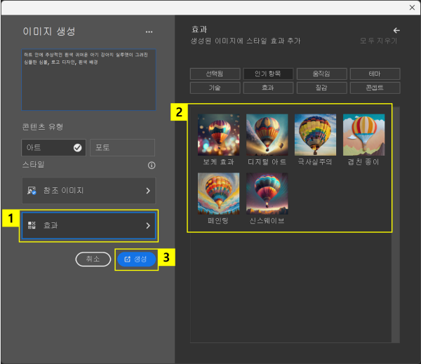 ‘스타일’ 옵션에서 다양한 효과를 추가할 수도 있습니다. 움직임, 테마, 기술, 효과, 질감, 콘셉트 카테고리에서 원하는 스타일 효과를 클릭하여 추가해보세요. 이번에는 참조 이미지와 최대한 유사한 결과를 위해 효과를 선택하지 않았습니다. 모든 설정이 완료되었다면 ‘생성’ 버튼을 클릭합니다.