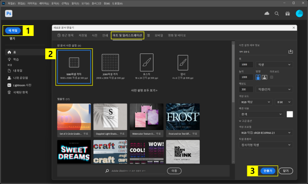 - ‘새로운 문서 만들기’ 창 > 아트 및 일러스트레이션 > ‘1000픽셀 격자’ 클릭