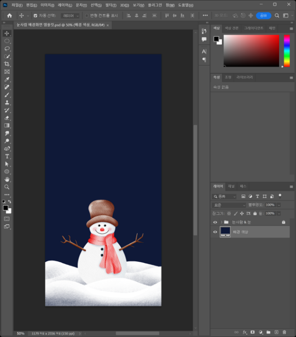 다운로드받은 눈사람 배경화면 템플릿 파일을 포토샵에서 열면, ‘1179x2556(px)’ 사이즈의 캔버스와 배경 색상 칠 레이어, 눈사람 이미지를 확인할 수 있습니다. 캔버스 크기는 ’iPhone 15 Pro’ 기종의 해상도를 기준으로 설정되어 있습니다.