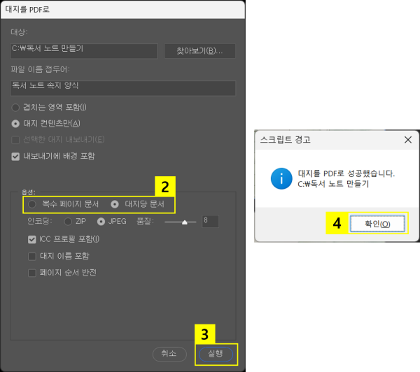 - ‘대지를 PDF로’ 창 > 옵션 설정 (대지당 문서)