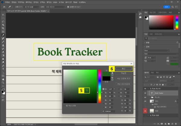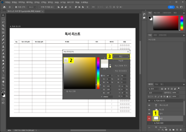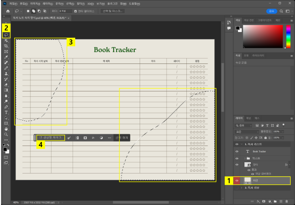 배경색을 변경한 후에는, 양식 표 색상도 변경해 보세요. 해당 레이어에 ‘색상 오버레이’ 효과를 추가하여 표 색상을 전체적으로 바꿀 수 있습니다. 이를 통해 시즌별, 주제별로 다양한 분위기의 독서 노트 디자인이 가능합니다.