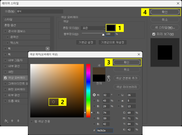 - ‘레이어 스타일’ 창 > ‘색상 피커’ 클릭하여 열기