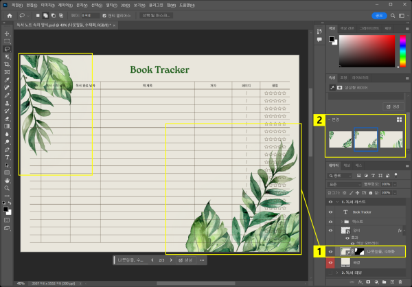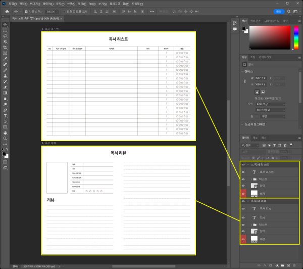 다운로드받은 ‘독서 노트 속지 양식 PSD 파일’을 포토샵에서 열면, A4 사이즈(210x297 mm)로 설정된 두 개의 캔버스와 함께 배경 색상을 입힐 수 있는 레이어 및 양식 구성 레이어들을 확인할 수 있습니다. 이 템플릿은 사용자가 '독서 리스트'와 '독서 리뷰'를 기록할 수 있도록 두 가지 양식을 제공합니다.