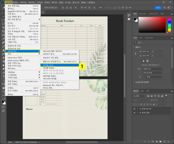 독서 노트 속지를 완성한 후, 포토샵에서 PDF 형식으로 저장하면 굿노트 앱에서 사용할 수 있으며 온라인으로도 판매가 가능합니다. Adobe PDF 형식으로 저장한 굿노트 독서 노트 속지는 굿노트 앱에서 확대해도 선명함이 유지되는 장점이 있죠. 해당 템플릿 파일은 2개의 아트보드(대지)가 포함되어 있으므로, ‘대지를 PDF로 내보내기’ 기능을 이용해야 합니다.