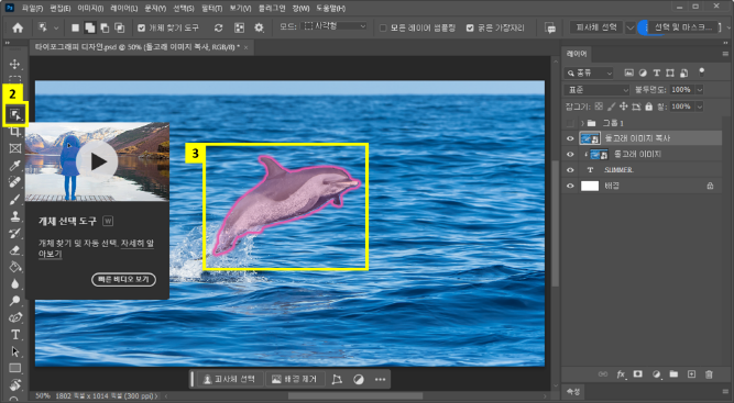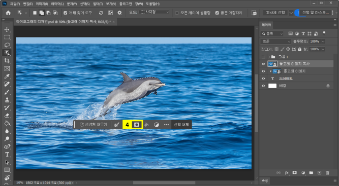 여기에 레이어 마스크 기능을 활용하여 텍스트 위에 입체적으로 돌고래가 튀어나오는 듯한 효과를 만들어 보겠습니다.