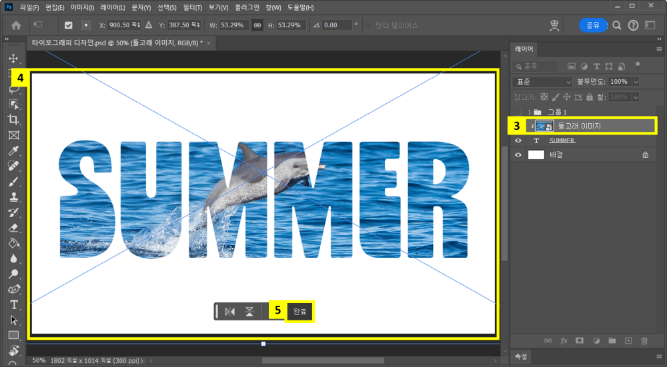 - ‘자유 변형 도구’(단축키: Ctrl + T 또는 Command + T) 실행 > 텍스트 중심에 사진 속 메인 개체(예: 돌고래)가 오도록 사진 크기 및 위치 조정
