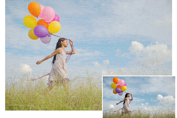 파란 하늘과 들판 사이로 풍선을 든 아이가 걸어가고 있는, 동화의 한 장면을 연상시키는 사진입니다. 디지털 사진 느낌의 원본을 감성 사진으로 만들어, 사진이 가진 분위기를 극대화해보겠습니다.