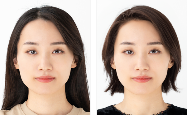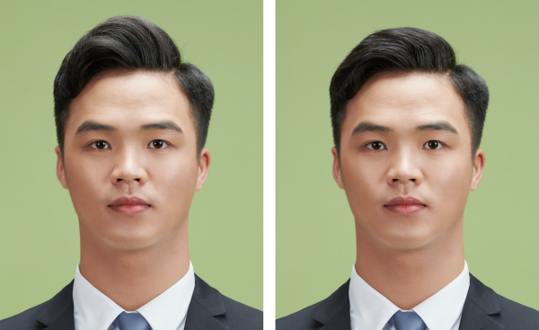 복장을 단정한 정장으로 변경한 후, 머리 스타일도 더욱 깔끔하게 바꿀 수 있습니다. 특히 여권 사진 규정에 따라, 머리카락이 눈썹이나 얼굴의 윤곽을 가리지 않도록 주의하며 수정하는 것이 중요합니다.