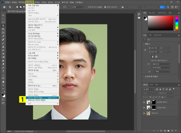 - 상단 메뉴 바 > 레이어 > ‘보이는 레이어 병합’ 클릭