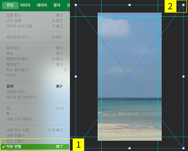 - ‘편집’ > ‘자유 변형’ 선택
