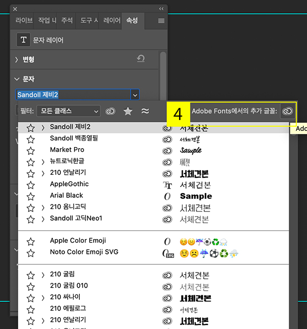 - (원하는 글꼴이 없을 경우) ‘Adobe Fonts에서의 추가 글꼴’ 옆 아이콘 선택하기