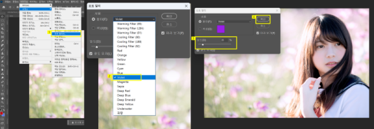 포토 필터(Photo Filter) 기능을 사용하면 이미지에 특정한 색조를 추가해 색감을 보정하거나 분위기를 연출할 수 있습니다. 이는 디지털 사진을 필름 카메라처럼 사진 보정하는데 많이 사용합니다.
