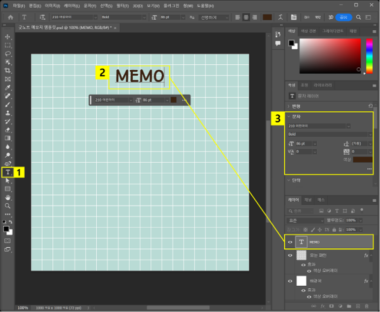 메모지 배경색과 모눈 패턴의 색상은 포토샵의 ‘레이어 스타일’ 효과 중 ‘색상 오버레이’를 활용하면 쉽고 간단하게 바꿀 수 있습니다. 레이어 패널에서 적용된 레이어 스타일을 더블 클릭하고 색상을 변경해 보세요.