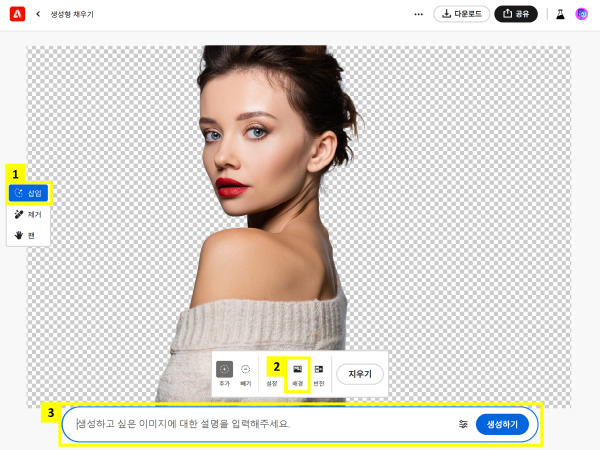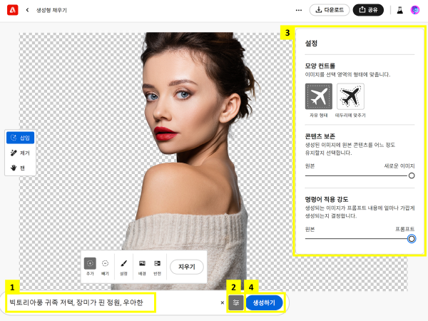 - 모양 컨트롤: 생성된 이미지를 사용자가 선택한 영역의 모양과 얼마나 가깝게 일치시킬지 결정
