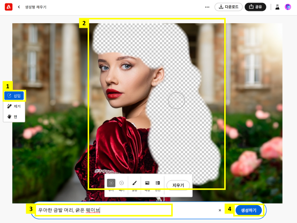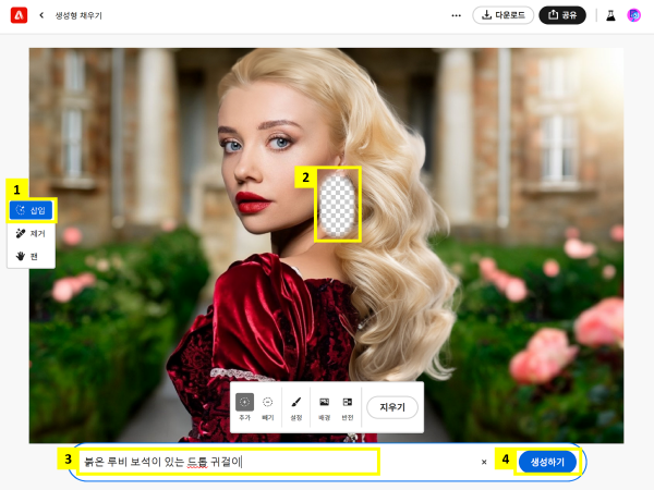 인물의 옷, 헤어, 귀걸이 부분을 브러시로 칠하고 프롬프트를 구체적으로 입력해 보세요. 스타일, 장식, 색상을 구체적으로 지시할 수 있습니다.