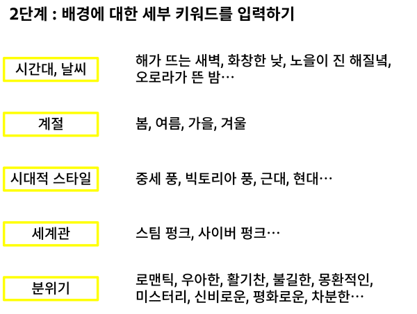 만들고 싶은 배경 주제를 결정했다면 이제 구체화할 차례입니다. 해당 배경이 어느 시간대 또는 계절인지, 어떤 시대인지, 어떤 분위기인지 세부 디테일을 더하는 키워드를 입력해 보세요.