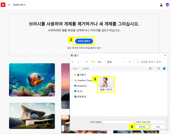 ‘생성형 채우기’ 기능은 이미지의 부분적인 편집을 쉽고 빠르게 도와주는 디자인 도구입니다. 어도비 파이어플라이 측에서 제공하는 샘플 이미지 에셋을 선택하거나, ‘이미지 업로드’ 버튼을 클릭하여 로컬 이미지 파일을 업로드하여 시작할 수 있습니다.