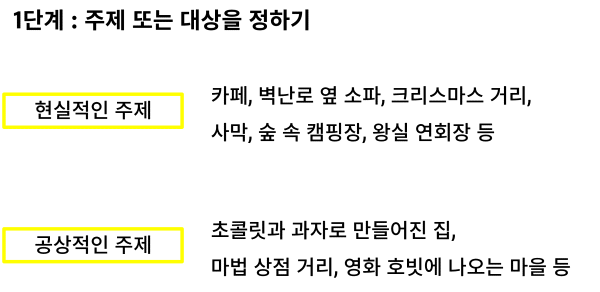 위의 세부 키워드들을 골랐다면, 추가로 배경에 포함된 인물, 동식물 또는 물건들에 대한 묘사를 더해보세요. 어떤 물건들이 놓여있는지, 물건은 무슨 색인지, 어떤 사람이 등장하는지, 동식물이 있다면 어떻게 생겼는지에 대해 묘사한다면 생성형 AI가 이에 맞는 이미지를 생성해 줄 것입니다.