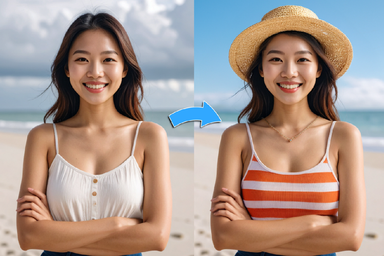 포토샵의 '생성형 채우기(Generative Fill)' 기능은 이미지 내 특정 영역만 선택해 원하는 스타일로 교체하거나 추가할 수 있는 강력한 AI 합성 기능입니다. 특히 인물 사진에서 의상을 변경하거나 액세서리를 합성할 때 매우 유용합니다. 다양한 시안을 AI가 제안하므로, 원하는 느낌에 가장 잘 맞는 스타일을 선택해 적용할 수 있습니다.
