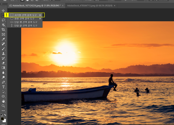 - ‘윤곽 도구’ > ‘사각형 선택 윤곽 도구’ 클릭
