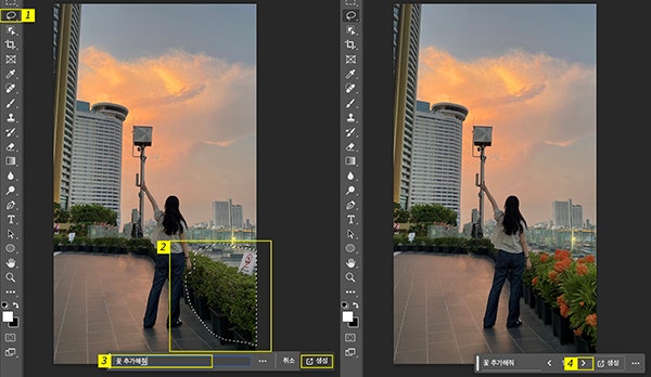 (개체보다 넓은 범위를 선택해도 인공지능이 자동으로 개체를 인식해요.) - ‘생성형 채우기’ 선택하고, 프롬프트 입력 없이 ‘생성’ 선택하기