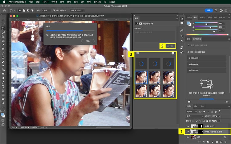 속성 패널에서 생성 버튼을 한번 누를 때마다 3개의 변경 이미지가 생성됩니다. 반복하여 생성 버튼을 클릭하여 원하는 변경 이미지가 나올 때까지 여러 이미지를 생성하여 선택하고 원하는 이미지를 만든 후에 불필요한 변경 이미지는 삭제하여 파일 크기를 조정할 수 있습니다.