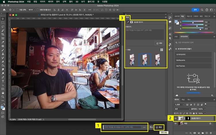 가운데 걸어오는 사람이 주요 인물로 가야 할 시선을 방해하고 있어서 사진에서 지워보도록 하겠습니다. 삭제하고자 하는 부분을 선택하여 활성화된 생성형 채우기를 클릭합니다. 부분을 삭제하기를 원할 때는 프롬프트에 텍스트를 입력하지 않고 비워 둔 채 생성을 클릭하면 바로 삭제 부분을 채우는 변경 이미지가 생성됩니다.
