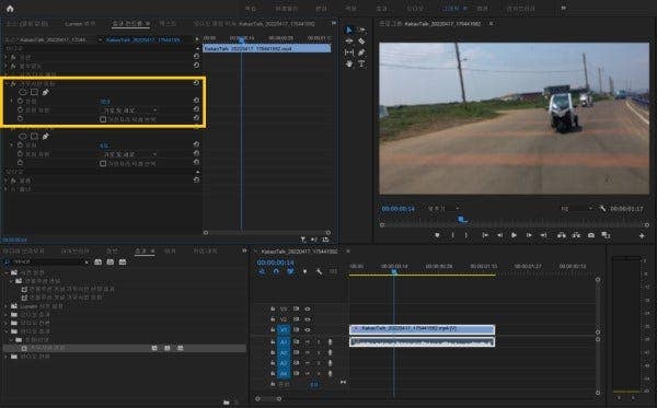 영상 편집에 앞서 보정할 영상 클립을 프리미어 프로로 불러와 주세요. 먼저, 좌측 하단의 [효과]툴을 선택합니다. 이후, 흔들림 보정을 적용할 장면을 타임라인에서 선택한 후 [비디오 효과] > [비틀기 안정기]를 더블 클릭하여 효과를 적용해 주세요. [비틀기 안정기]를 더블 클릭하면 [안정화 중]이라는 문구가 뜨고 이후 효과가 장면에 적용됩니다.