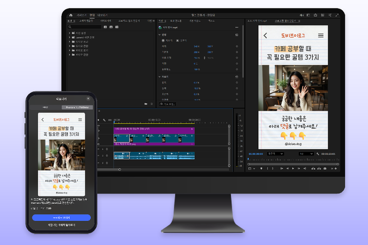 인스타그램 릴스는 짧고 임팩트 있는 영상으로 브랜드와 개인 크리에이터 모두에게 중요한 채널로 자리 잡았습니다. 하지만 기본 제공되는 편집 도구만으로는 한계가 있어, 원하는 퀄리티를 구현하기엔 아쉬움이 있죠. 프리미어 프로를 활용하면 색감 보정, 화면 비율 조정, 속도 변화까지 손쉽게 다룰 수 있어, 짧은 영상에도 전문적인 느낌을 더할 수 있습니다. 모바일과 PC를 연동해 언제 어디서든 이어서 편집하고 손쉽게 인스타그램 릴스 만들어보세요.